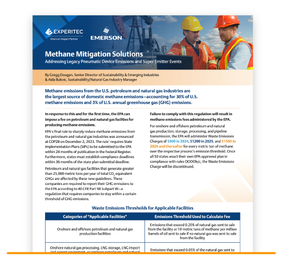 With available zero emissions technologies from Emerson, it will be easier to comply with the EPA’s new emissions standards. Additionally, a facility can mitigate the risk of a super emitter event and subsequent notification with Emerson’s wireless monitoring solutions.